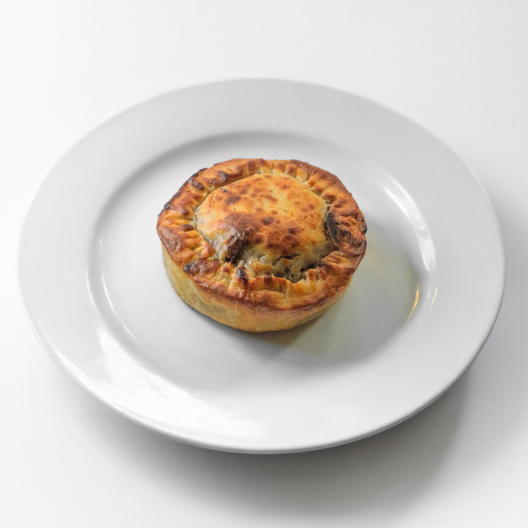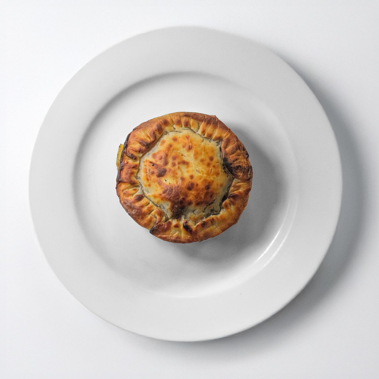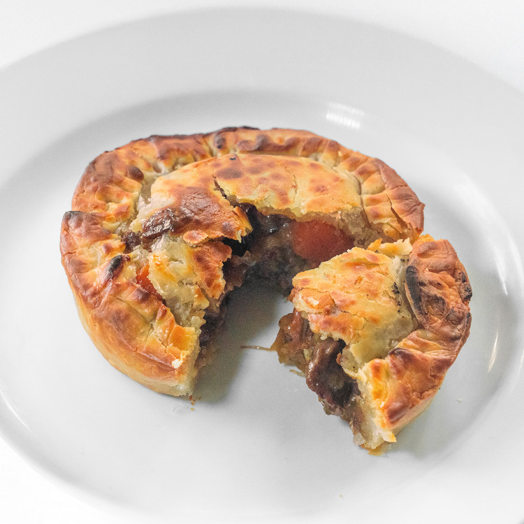 Traditional South African lamb pie. The meat is slow cooked for more than three hours and includes veggies such as carrots, onions, herbs and delicious broth.
